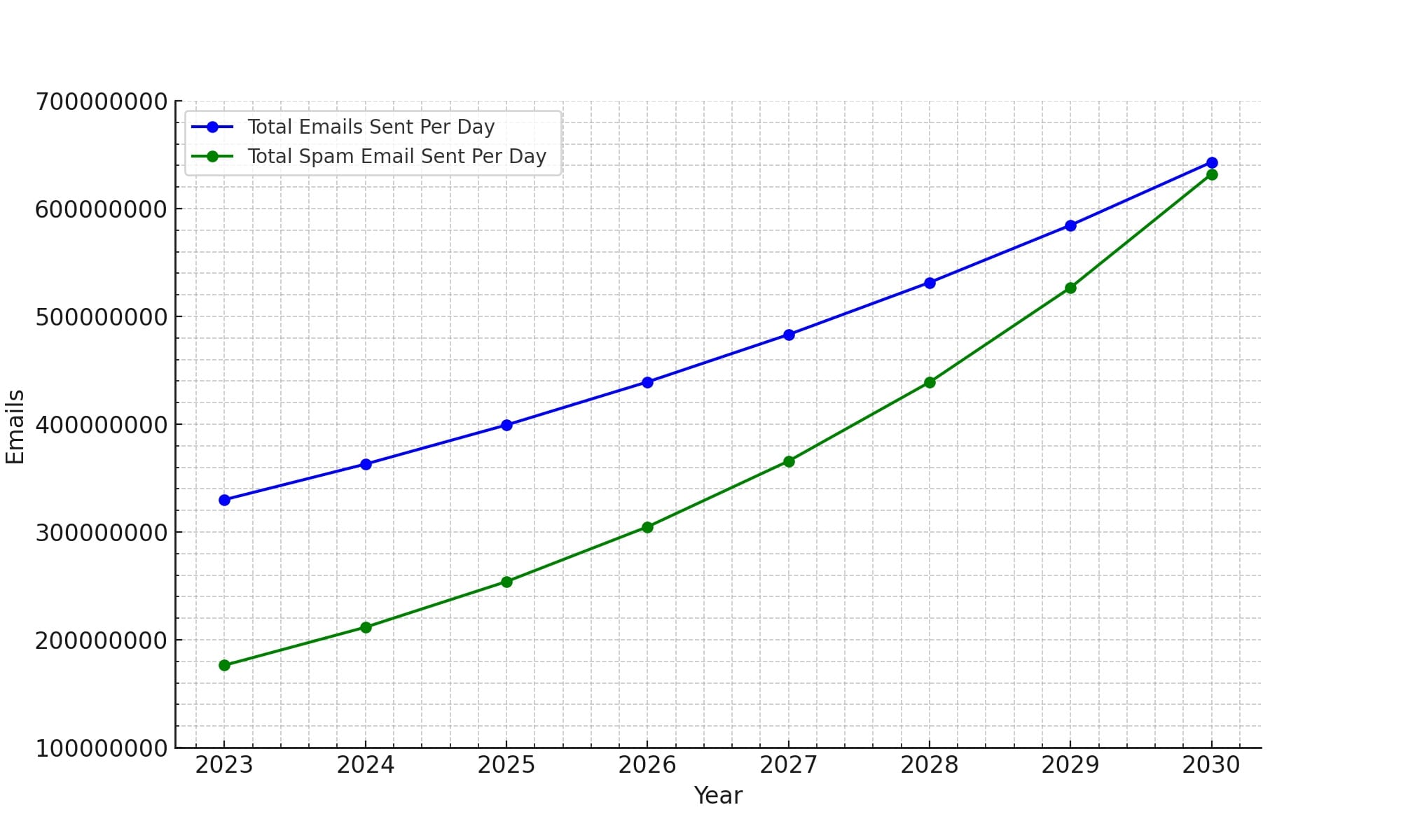 📈 In our maybe not hypothetical scenario where AI is just sending way more mail, which it already is, if we increase the volume of email by just 10% YOY per day, and also increase the volume of spam by 20% YOY per day, because if nothing else is certain it will go up by some amount, then the number of spam emails will be roughly equivalent to the number of total emails sent per day by 2030, with 640 billion emails and spam, each, per day, for a combined total of 1.28 trillion sent each day, and 467.2 trillion combined emails and spam sent annually.