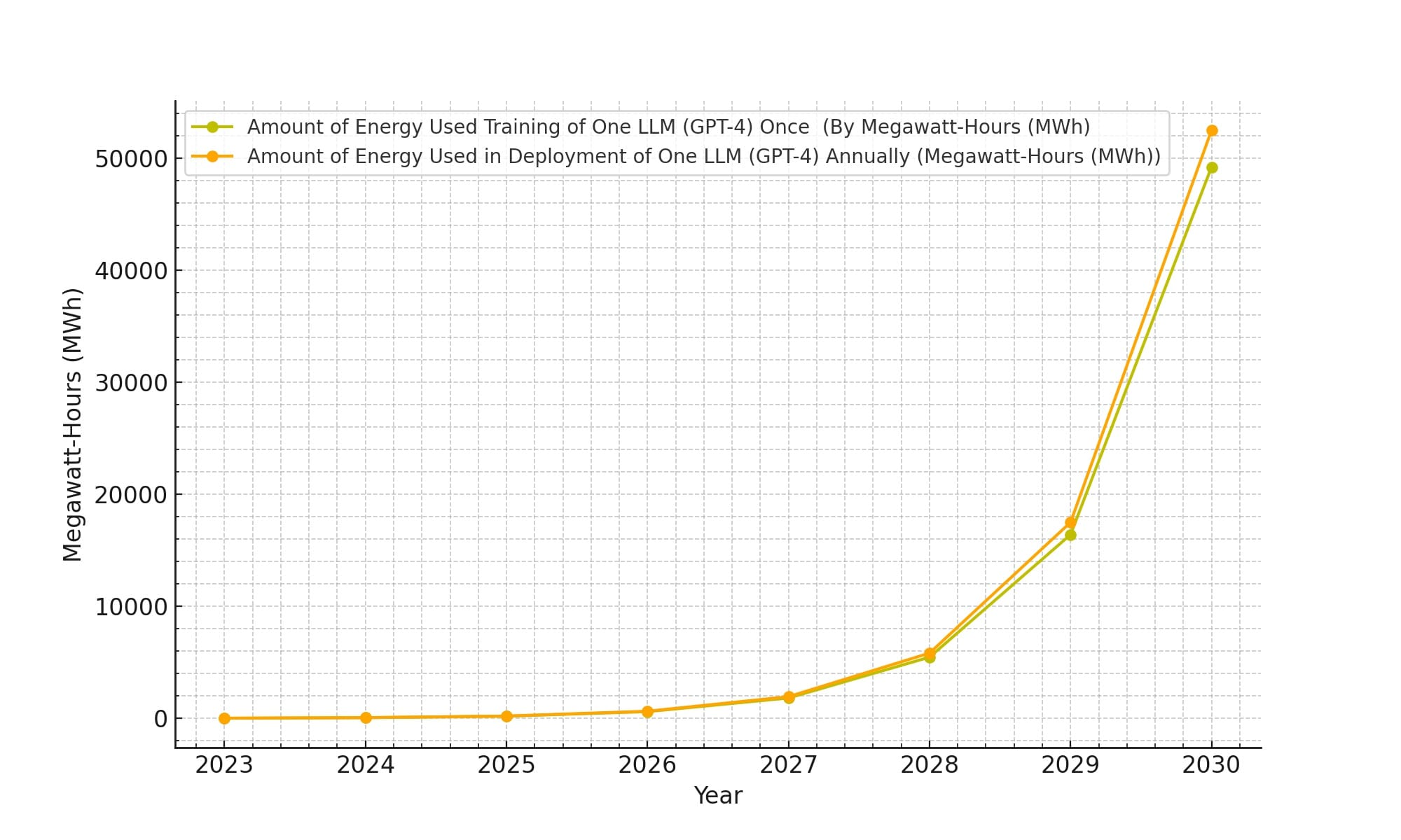 LLMs do not train and run themselves as we saw in the initial numbers above, so let’s assume both the requirements for training and deploying ONE model like GPT-4 will increase in power by 2x each year, slightly faster than Moore’s Law because, at least right now, it seems to be accelerating faster than 2x every 2 years for AI.