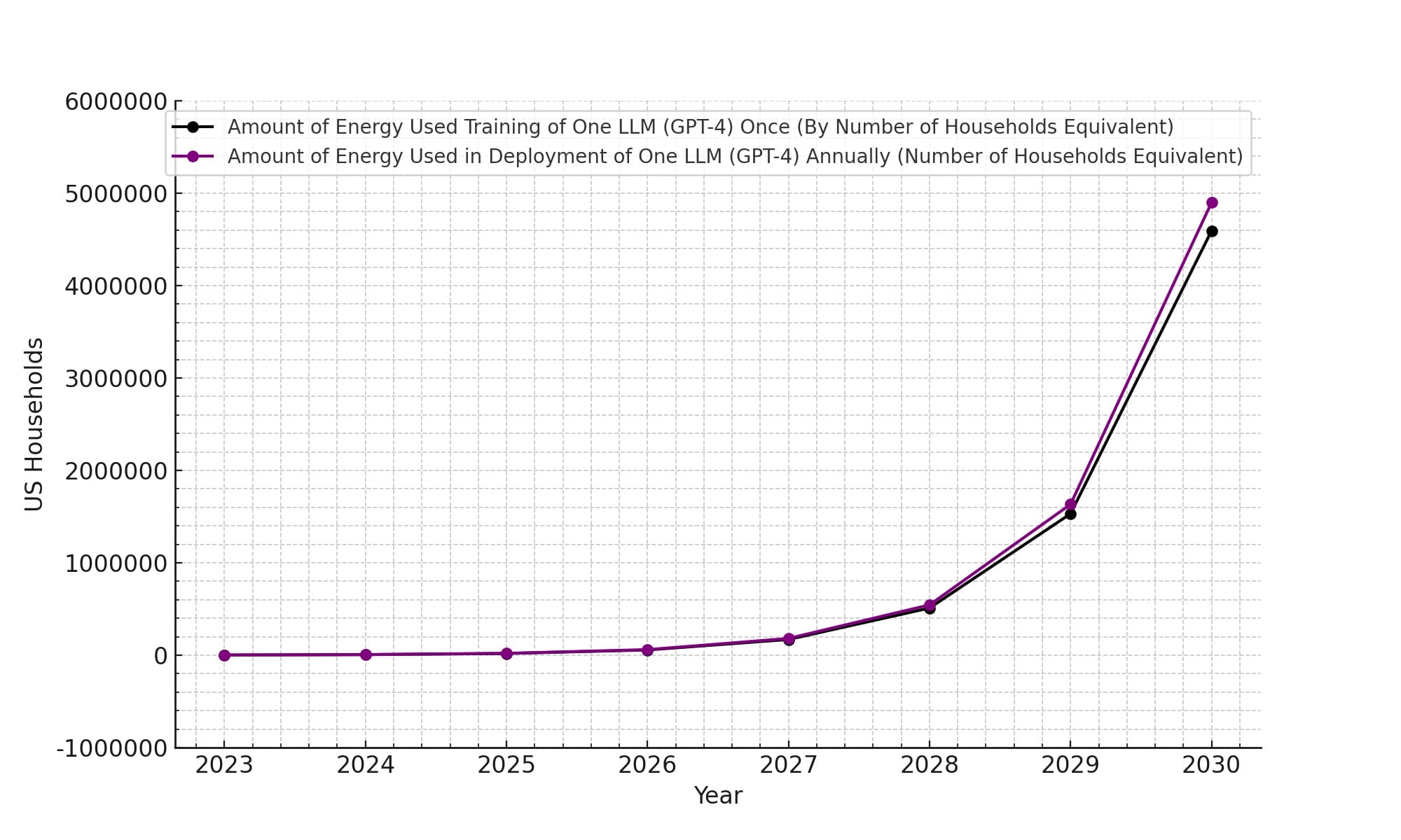 📈 By 2030, we reach a total MWh equivalent of nearly 5 million U.S. households in for training each comparative models ONCE, and then another for 5 million households of MWh equivalence for running them annually. Again this would be for ONE LLM the size and scope of GPT-4 like Anthropic’s Claude, Meta’s LLAMA, or Google’s Bard, amongst many many others, and there will be many many many others.