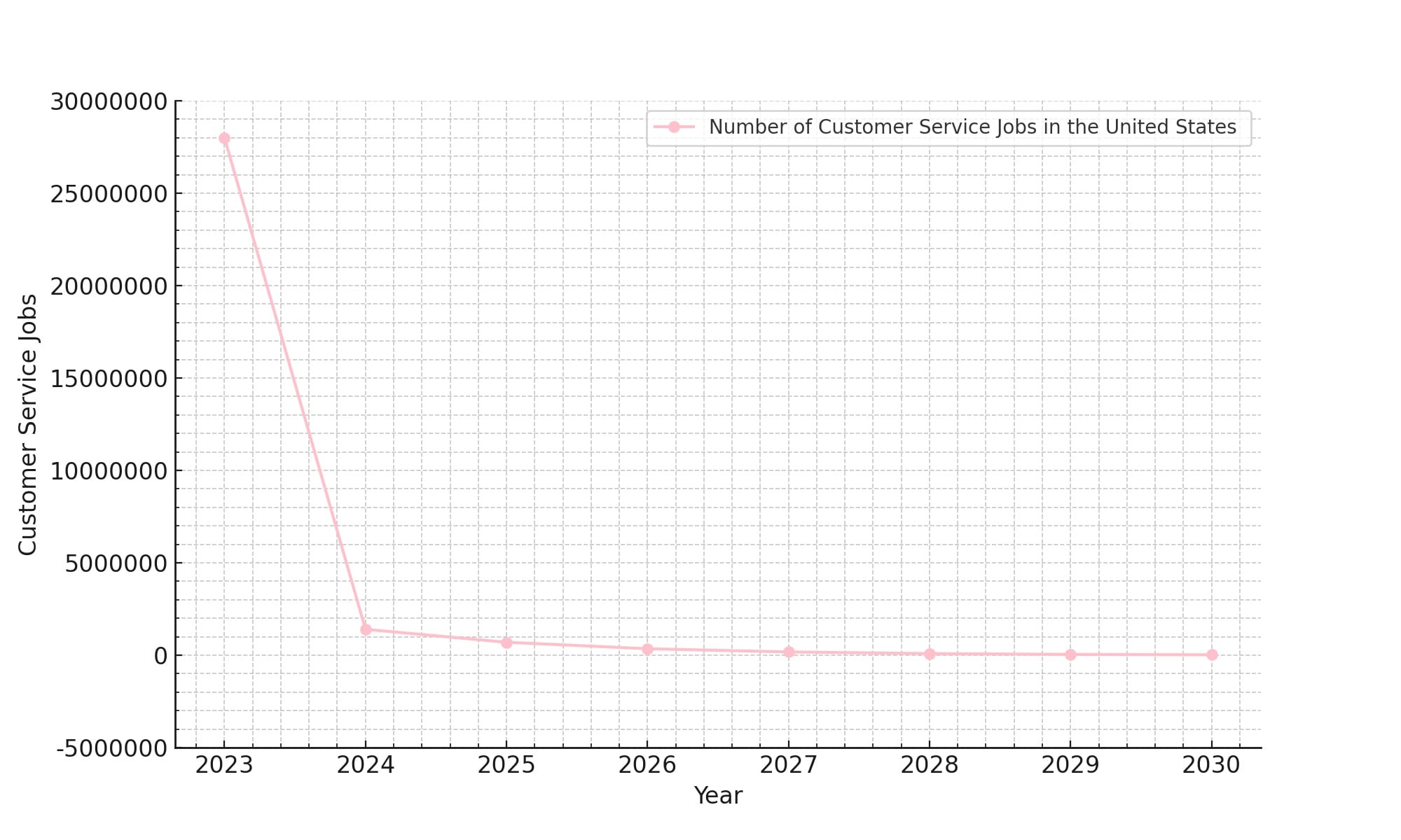📉 Finally assuming a precipitous decrease of real humans doing customer service work, such as replying to emails, chats, or phone calls, due to the correlated increase in LLMs and their adoption at scale, there will be near zero humans doing any sort of written or spoken customer service work not in 2030, but in the year 2024, if we decrease the number by half every year. In 2030 there will be .02 humans still doing customer service. And I don’t mean 2% of the current amount, I mean .02 of one (1) single unit of human.