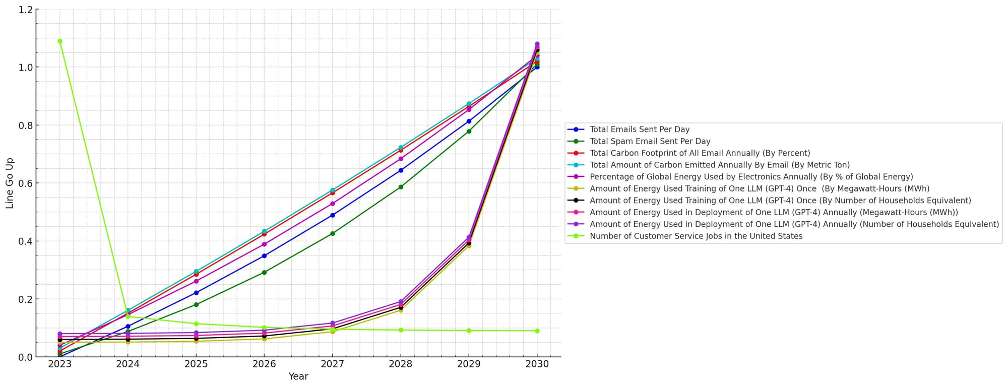 🥸 Note once again that I am not a researcher or knighted academic. That said, I did take real world numbers (see above) from some light research done in the wee hours after my infant daughter falls asleep, and used those numbers as a basis. I then extrapolated moderate to wildly exponential and completely made up increases YOY through 2030. If you are a real researcher, well, bully for you, someone should pay you to do this as a true peer reviewed study you can publish somewhere and get tenure so people can throw inkwell pens at you in the cafeteria for your tremendous achievement.